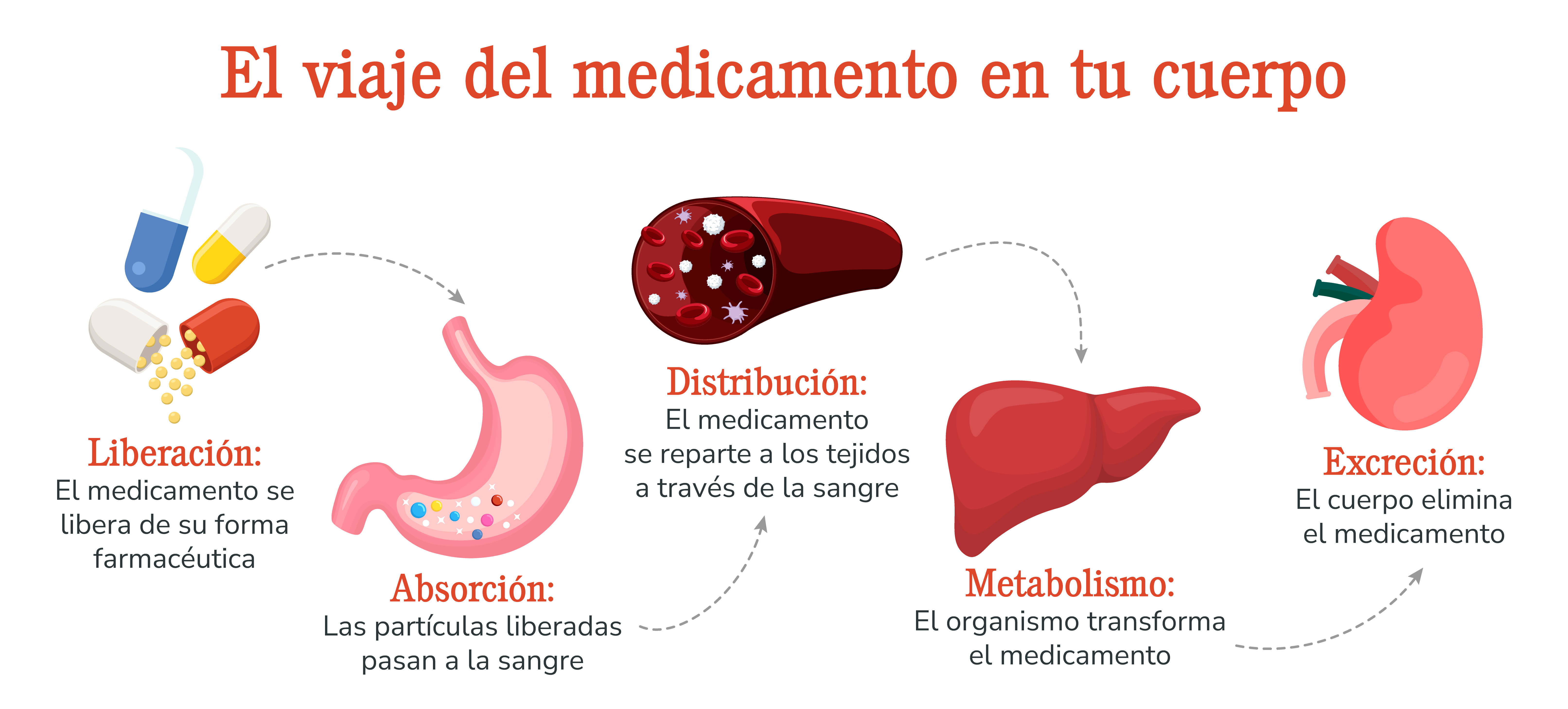 Ya hablamos un poco de farmacodinamia; ahora hagamos un "viaje" por el cuerpo para entender la farmacocinética, es decir, el recorrido que sigue una tableta desde que la tomamos hasta que cumple su misión.