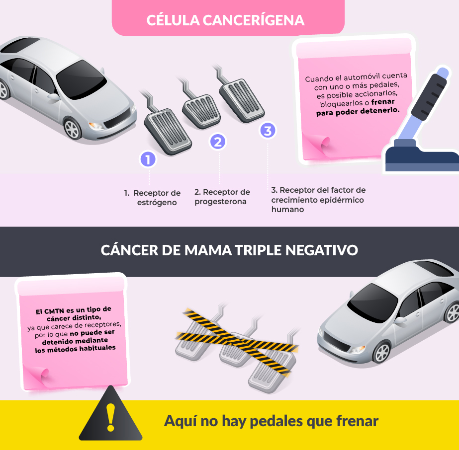 Para entender el CMTN, puede utilizarse una metáfora sencilla. Imaginemos que una célula cancerígena es como un automóvil que puede acelerar gracias a distintos “pedales”. En muchos tipos de cáncer de mama, esos pedales corresponden a receptores hormonales o proteicos: