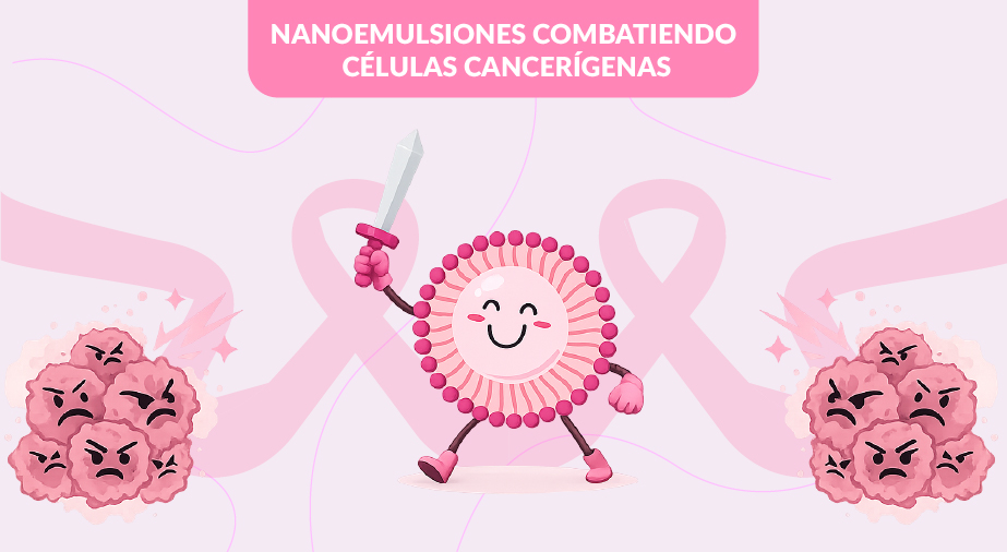 Figura 2: Descripción: Imagen alusiva a una nanoemulsión combatiendo células cancerígenas, acompañada del símbolo del listón de la lucha contra el cáncer de mama. Este tipo de vehículos puede transportar fármacos de manera más específica y con menores efectos adversos. Idea original: Martha Silvia González Gómez.