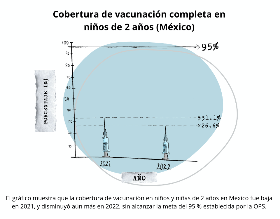 Uno de los principales factores asociados al aumento de casos es la disminución en la cobertura de vacunación. En México, por ejemplo, la prevención del sarampión se basa en la vacuna triple viral, la cual protege contra sarampión, rubéola y parotiditis. El esquema nacional de vacunación recomienda aplicar la primera dosis a los 12 meses de edad, seguida de un refuerzo a los 6 años. (6) Sin embargo, en 2021 la cobertura estimada de la primera dosis en niñas y niños menores de cinco años fue de 72.6%, y en 2022 descendió a 61.8%, lo que evidencia una tendencia a la baja en la vacunación infantil.(7)