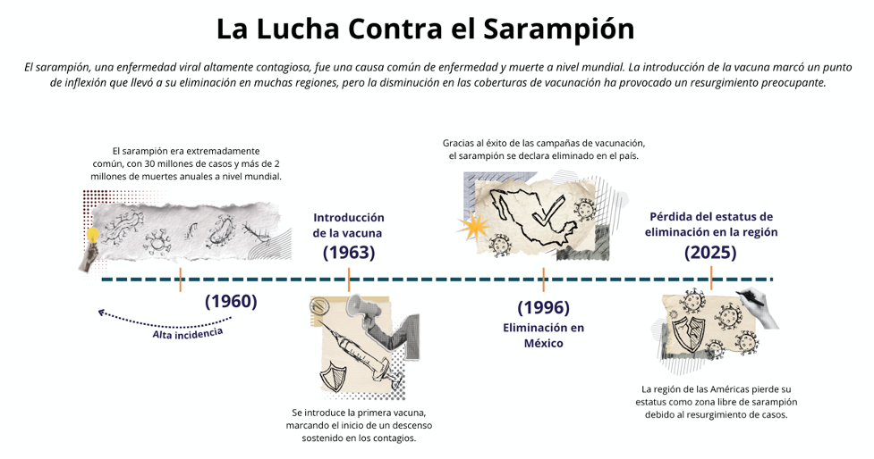 Con la introducción de la primera vacuna contra el sarampión en 1963, los casos comenzaron a disminuir de forma sostenida durante la segunda mitad del siglo XX. (1) En México, gracias a las campañas de vacunación, el sarampión fue declarado eliminado en 1996.(3)