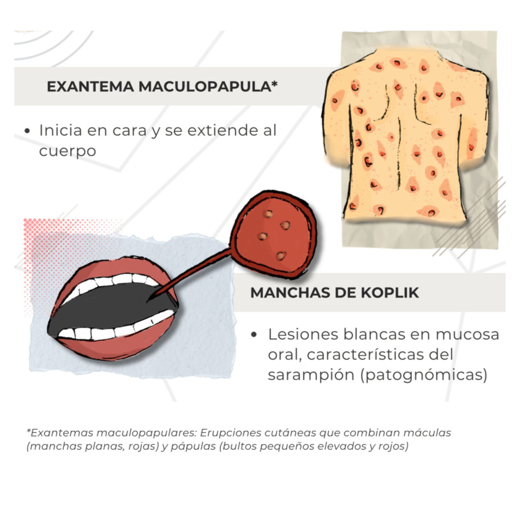 Tras la infección, además de fiebre alta, tos, escurrimiento nasal y conjuntivitis, suelen aparecer manifestaciones características que permiten reconocer la enfermedad. Una de ellas es un tipo de erupción cutánea conocida como exantema maculopapular o morbiliforme (Imagen 1). Otra señal distintiva es la presencia de pequeñas manchas blanquecinas en la mucosa de la boca, llamadas manchas de Koplik, consideradas un signo clásico del sarampión. Aunque en muchos casos la enfermedad se autolimita y cursa sin complicaciones, no debe considerarse benigna: se estima que entre 1 y 500 de cada 10,000 personas infectadas fallecen como consecuencia del sarampión.(1)