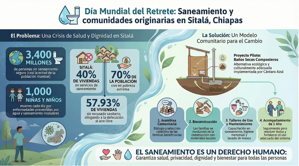 En 2022, la organización civil Cántaro Azul implementó 10 baños secos composteros en cinco comunidades de Sitalá. El objetivo principal fue promover cambios de hábitos en materia de saneamiento mediante un sistema alternativo que, por tabúes y percepciones negativas, suele enfrentar resistencia para su apropiación. Para fortalecer este proceso piloto, se colaboró con la Alianza Crecer Juntos por Sitalá.